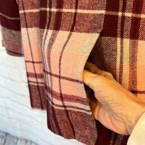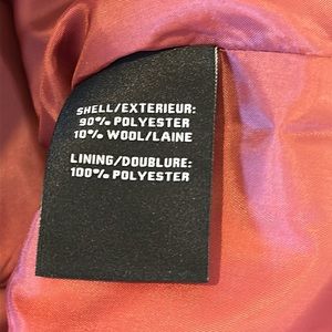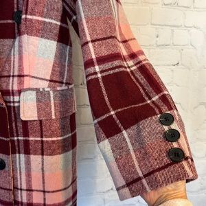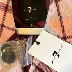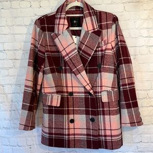 New beautiful burgundy and rose colored wool blend jacket/coat! 7 for all mankind Los Angeles! Double breasted look with front flap pockets! Back features bottom vent for comfort that is still sewn closed! Size M but would fit a M to Large! Pit to pit is approx 20 inches! Length is approx 30 inches!