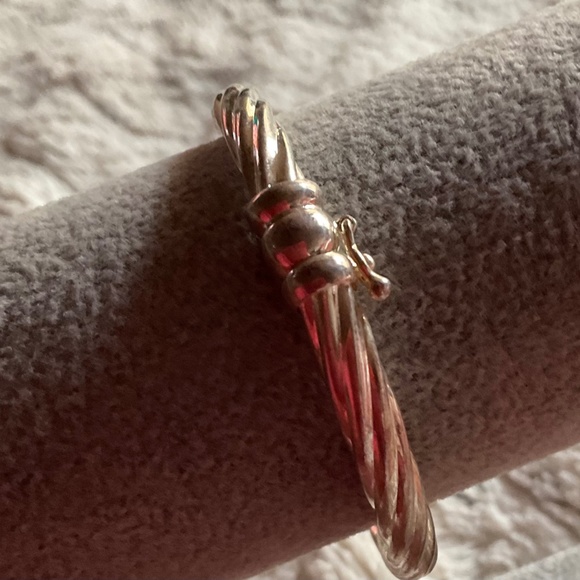 925 STERLING BANGLE with an etched ribbon design. This solid piece fits an average wrist. Shaped for your arm…oval for a better and comfort fit. Hook and click clasp for safety. This one is a solid vintage beauty. 19.20 grams of 925