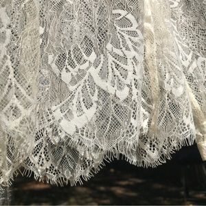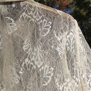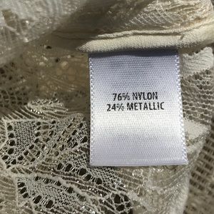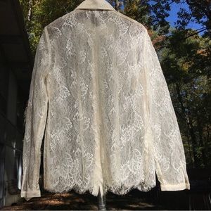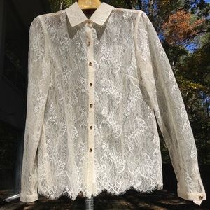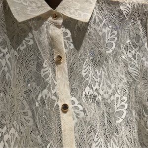 This stunning sheer leaf lace blouse features amber/gold buttons, a spread collar, and a sleek silhouette. Cream-gold lace. Fantastic condition with no signs of wear.