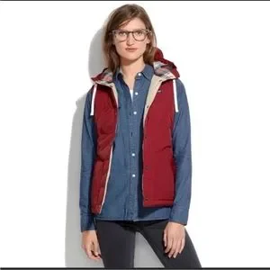 Excellent condition red hooded puffer vest! One small mark as shown on back that I have not tried to remove. Snap closure up front.