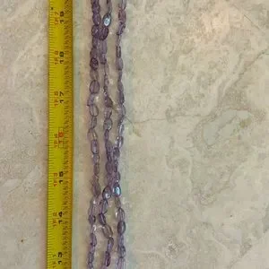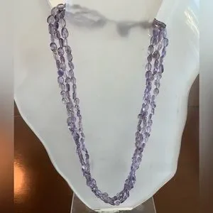 Shimmering 3 stand natural amethyst necklace. Can be worn alone or layered with a 2nd necklace as shown in the last picture. Lovely 25 inch length not including bead for clasp. Each necklace is sold separately and individually priced at $155.00 each. Have a total of three necklaces.