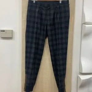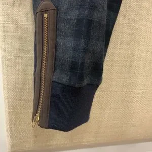 Another stunning piece by Japanese brand Kolor featuring grey and blue glendale check wool fabric with ribbed bottom section and ykk zipper, faux suede trim and fully lined interior.