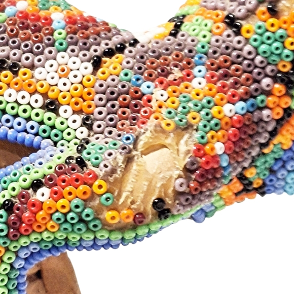 The most recognizable forms of Huichol art are yarn paintings and beaded objects, where intricate patterns are created by pressing beads and yarn into a wax-coated surface.