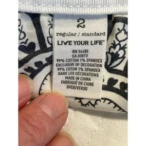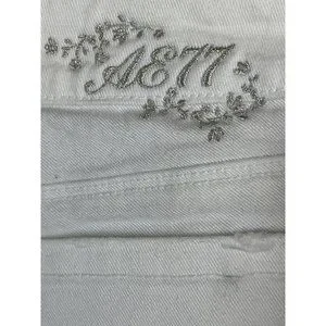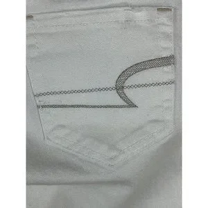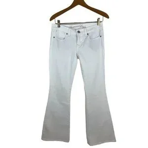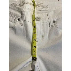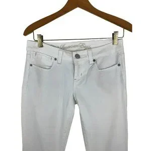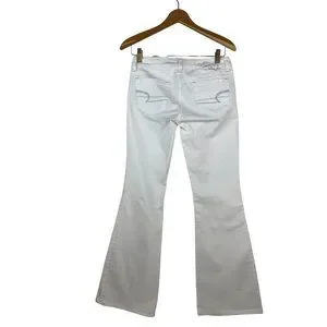 These fashionable American Eagle Jeans in size 2 are perfect for any season. The 5-pocket design with button, embroidered silver logo accents and flared style make them a chic addition to your closet. These machine washable jeans have a low rise of 7” inches and a 32-inch inseam. The white color is stylish right now. No flaws but could use an oxyclean bleach wash to make them truly optic white. 99% cotton.