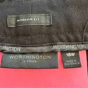 18W Worthington dress pants in basic black. Light weight and versatile. Flat front with button detail on back pockets. They have a thick material feel - like suit pants. MACHINE WASH and wear for easy care too!