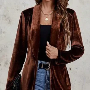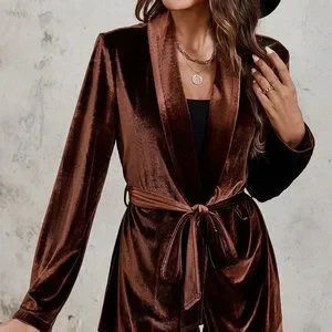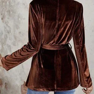 Brown Casual Womens Shawl Collar Belted Velvet Blazer