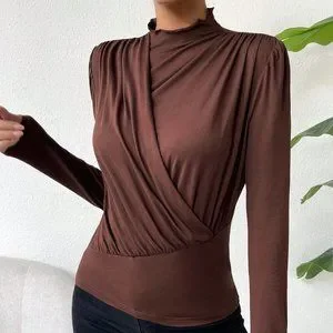 Brown Casual Womens Solid Ruched Mock Neck Tee