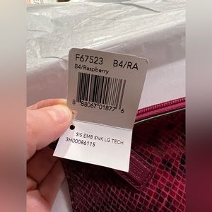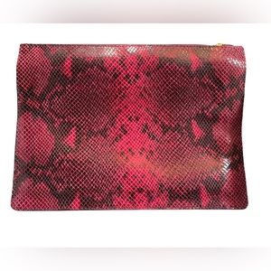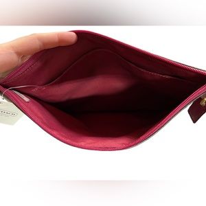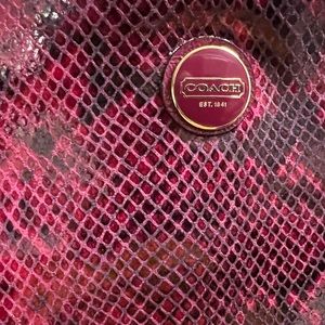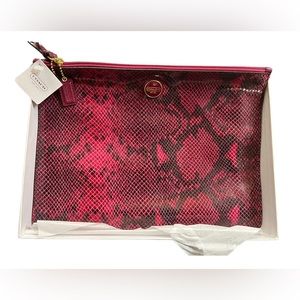 Coach large tech pouch, approx. 8”x12”. Raspberry and black snake print. I think it is leather, but don’t know for sure. Zip top and fabric lined with two sections on interior. Comes with box and tags. New!
