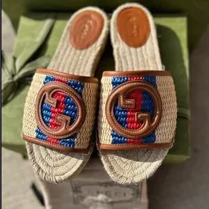 Worn once! Paperwork, box and packaging complete. Influenced by an archival design from the '70s, a hallmark era of the House, the Interlocking G appears as a defining leather detail atop this raffia espadrille. A leather trim follows the contours of the shoe, adding an extra pop of colour.