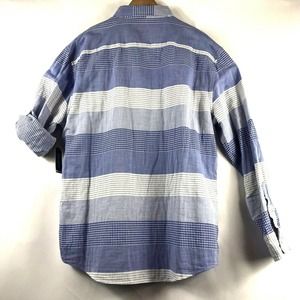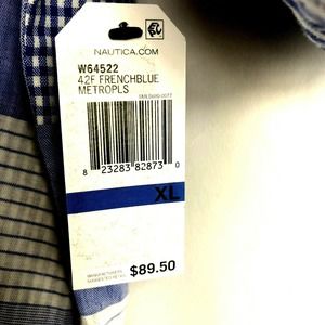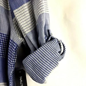 New with tags Men's Nautica Long Sleeve Metropolis Blue Patchwork-look Striped Shirt, Blue Striped/Solid/Checked pattern with roll-up sleeves. Tan button placket. One chest pocket. Slim Fit. MSRP $89.50.