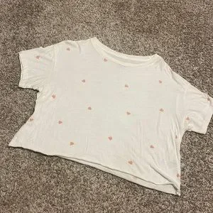 Pink cropped tee size small, but fits medium well too as it is a little flowy. Shirt has small pink hart pattern and some of the hearts say pink under them, as pictured. Material is super soft and cozy.