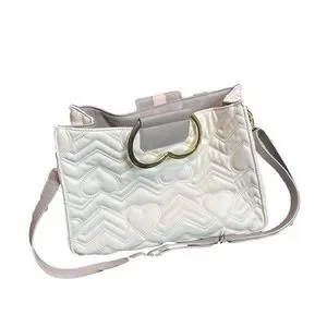 A white Betsey Johnson bag with a gray and pink stripe with little gold heart going up the front with gold heart handles and a Crossbody strap.