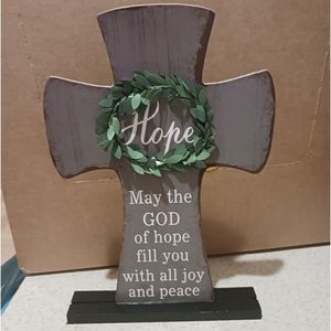 Gray Wooden Rustic Cross with the words written on it: HOPE May the God of hope fill you will all joy and peace