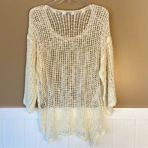 Closet Chic Small Crocheted Lace Cover Up, cream colored, 3/4 bell sleeves, hi-low hemline, scoop neck, like new condition. Perfect as beach cover up, layered over a cami, or whatever you like! Pit-to-pit 21”, Length 25”-28” front-to-back