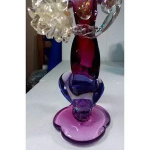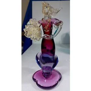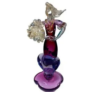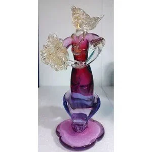 Add a touch of mid-century modern elegance to your home decor with this beautiful Murano Glass Figurine. Crafted in Italy, this stunning sculpture features a windswept woman in a purple and pink dress holding a bouquet of gold dusted flowers. The sparkling gold dust and hand-blown glass construction add a glossy finish to this original piece.