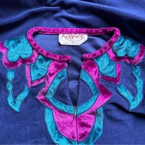 Gorgeous indigo housecoat with fuchsia and teal velvet accents.