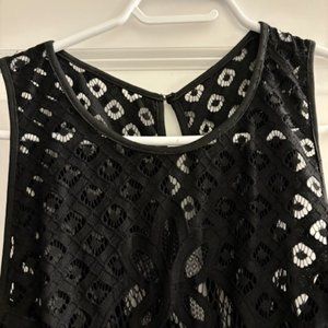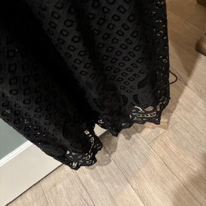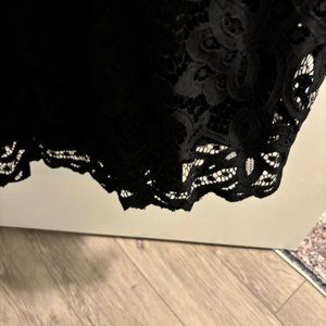 Beautiful maxi dress. I'm 5'9" and it hits the floor. Shell (lace) is 68% nylon and 32% cotton; lining is 100% polyester. Dress was worn once to a Christmas Party. It's a Size 10 but fits snug, like a Size 8.