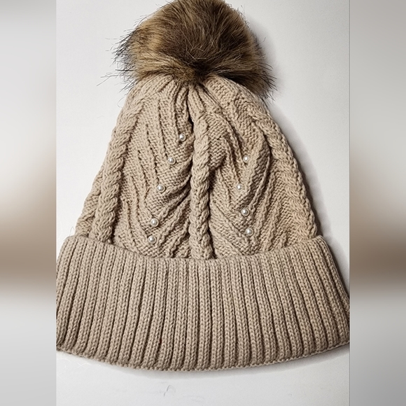 Beige Winter Women Ladies Fur Pom Pom Beads Pearl Knitted Beanie Hat.