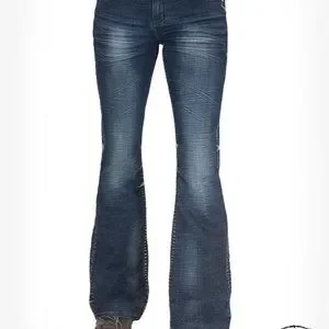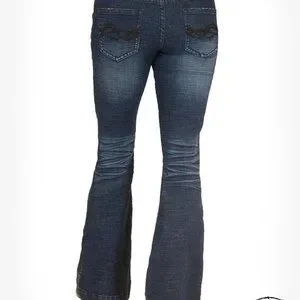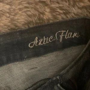 NWT - Mid Rise, dark wash, Aztec flare panel at side seams, black signature barbed wire pockets.