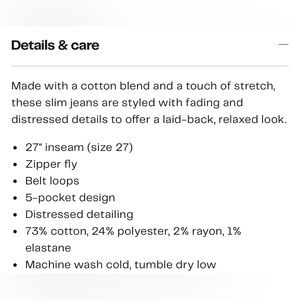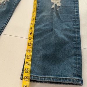 distressed cut. Approx measurements are 15” across the waist and 27” inseam. Cotton blend so jeans have a bit of stretch.