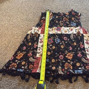 A flowey and flowery tank top from Style & Co. this top is a size medium and has a small ruffled collar and details on the bottom. The colors are black, white, pink, yellow, blue and green. The design is wonderful