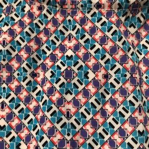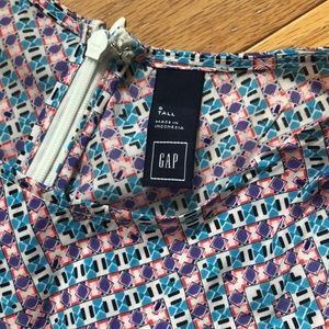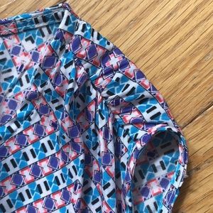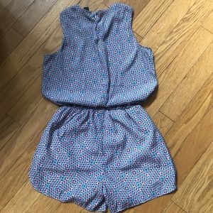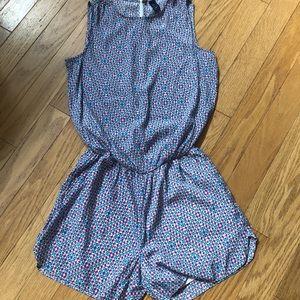 Super cute, lightweight sleeveless shorts romper from GAP. Fun and playful purple and blue geometric pattern. Has some cute details like mini-ruching at the top of the shoulders and a little cut at the side of the shorts. Shorts are lined for a nice bonus. Back zippered.