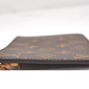 Never used! Neverfull PM pouch. For those everyday essentials, this is made of traditional Louis Vuitton monogram canvas complimented with a vachetta leather cowhide strap for convenience. The top zipper opens to a striped pink interior. This is an ideal case for travel of all sorts, for cosmetics, as a wristlet or without the strap as a chic clutch, with the luxury and style from Louis Vuitton. Comes with a dustbag. MADE IN FRANCE! Extra durable.