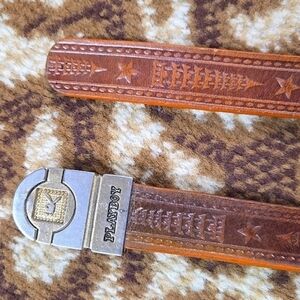 Vintage 80s Dejuno novelty belt buckle watch with Tooled leather strap and faux turquoise stone. A fun and unique piece, I've never seen anything quite like it. Battery needs to be replaced.