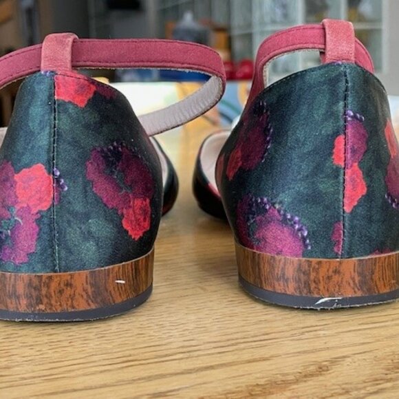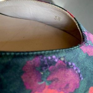 Gorgeous floral-patterned, velvety fabric flats, with suede and leather insides. The low 1.5 cm. (5/8 in.) heel is faced with faux woodgrain. The outer and inner materials show few if any signs of wear and are clean, with no stains, tears, or worn spots. The shoes were gently worn and the leather soles on the bottom are scuffed; the heels have minimal signs of wear as shown in photos. Beautifully made in Spain for the Anthropologie collection. Smoke-free pet-free home.