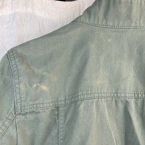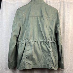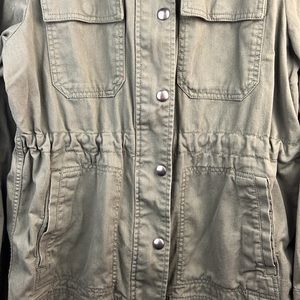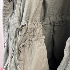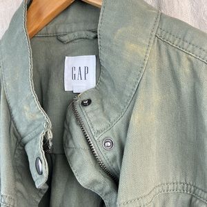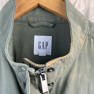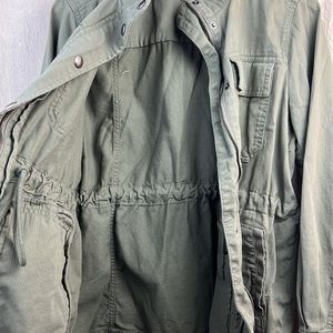 Gap Army Green Utility Coat. Size medium. Adjustable waist via ties inside the coat. Button snap and zipper closure. Multiple pockets - two chest and 2 hand pockets. Worn only once but there’s some slight discoloration and I can no longer return it. Other than that it’s in great condition.