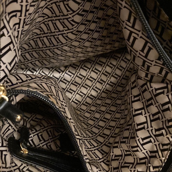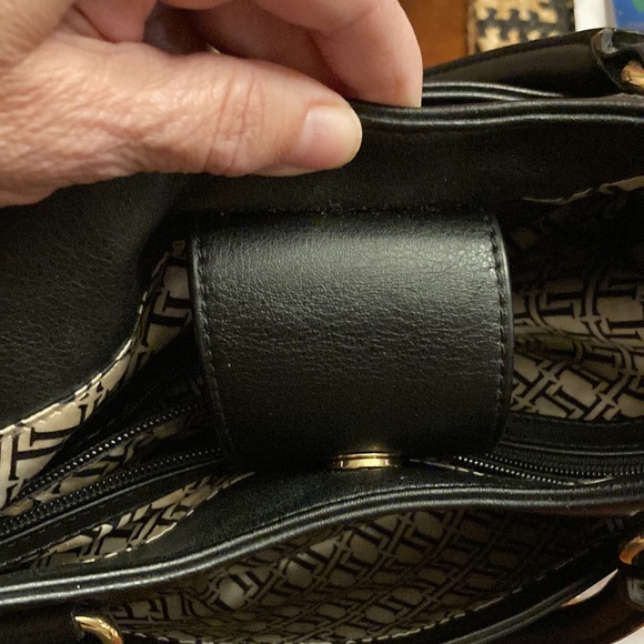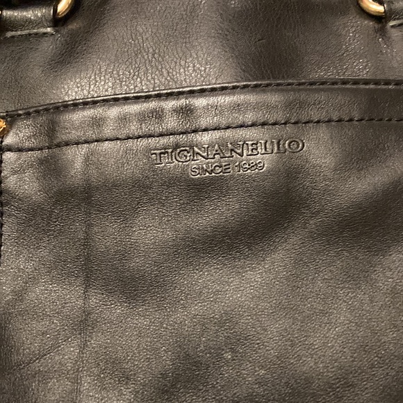 TIGNANELLO NAVY SHOULDER BAG WITH A STRAP AND HANDLES. There is a large compartment on the outside of both the front and the back of the purse. There are three large areas inside the purse and the middle area has a zipper. There is a zipper compartment on the inside of the purse +2 large slip pockets. This purse has many compartments and it is very roomy. It is navy. The inside is very clean. There is no sign of wear on the outside of the purse. The inside is very clean. It has gold hardware. The width of the purse is 15 inches the height of the purse without the handles is 10 1/2 inches, with the handles it’s 16 1/2 inches, and with the strap it is 22 inches. The depth is 3 1/2 inches. The edge of the outside back pocket, if you look close enough, may show a slight sign of wear. This person is really really nice.EUC