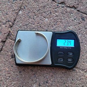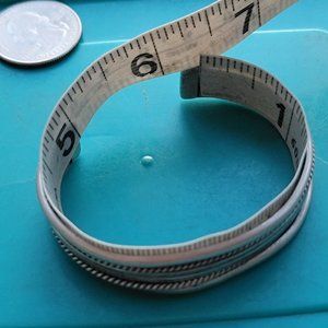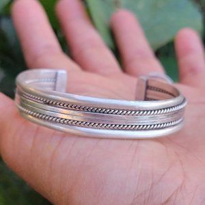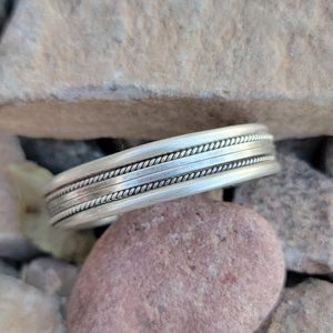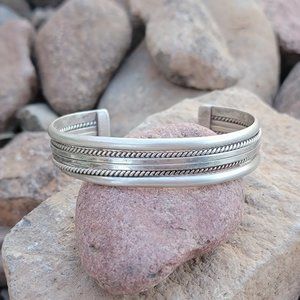 Fabulous solid 925 sterling silver Tahe Native American handmade bracelet featuring five shanks. The thickest one is in the center. A single line with a line engraved through it. Flanked by two rope borders and then wrapped with two plain smooth bands. Stamped "STERLING TAHE." The Tahe name (Navajo - Arizona, USA) has several different identifiable styles associated with it and more are appearing over time. Jewelry created in this name may or may be created by people related to one another.The best known style is very recognizable. They buy various types and gauges of wire and metal sheeting and work them into their final products. The style is popular with men and women alike; Robert Redford wore one of their bracelets in the movie "The Horse Whisperer". Faded stamp. Nice cuff thickness, not too thin nor too wide. Light patina. Beautiful bracelet for your stack or to wear alone. Tested and guaranteed sterling silver.