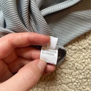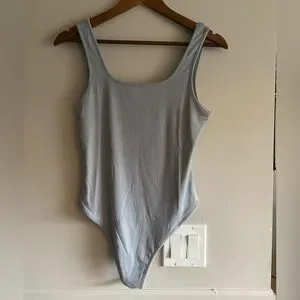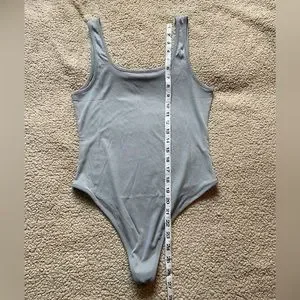 Details: Light gray ribbed bodysuit with a clasp closure on the bottom. Is a thinner material so can be a little bit sheer.