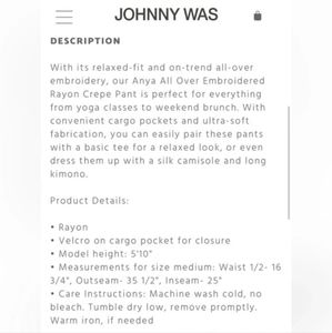 NWT Johnny Was Anya All over embroidered crepe pant size S
