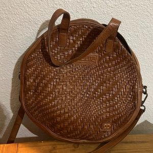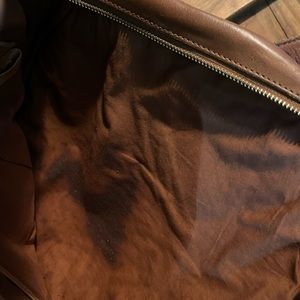 This purse is genuine leather and has one stain on the back side that probably could be cleaned with leather cleaner. This purse is pretty large size crossbody! Very unique cognac color purse.