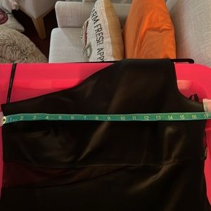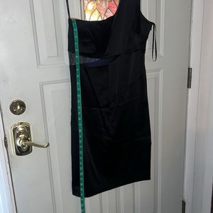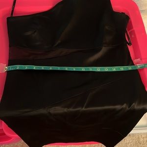 Beautiful black one shoulder Calvin Klein dress size 10. Worn once. Mesh cut out. Side zip. Small spot on left, rear shoulder (see pic), just needs dry cleaning. No rips, tears, or holes.