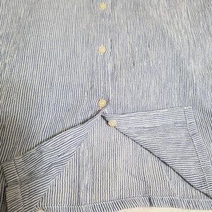 Beach, pool or street, this semi-sheer blue & white striped sleeveless camp shirt is laid-back sophistication at its best.