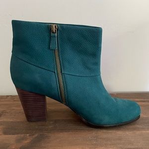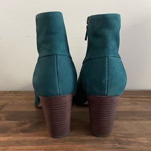 Keywords: boots, bootie, heeled, high heels, comfortable, winter, fall, suede, leather, turquoise, teal, blue, green, aqua, like new, ankle boots, ankle booties, chelsea