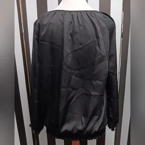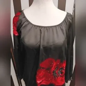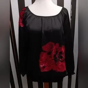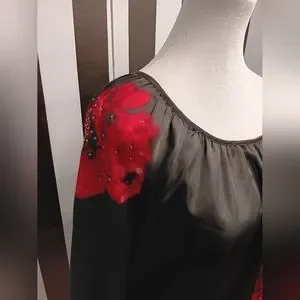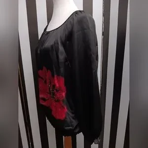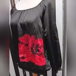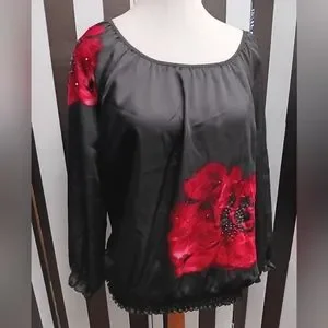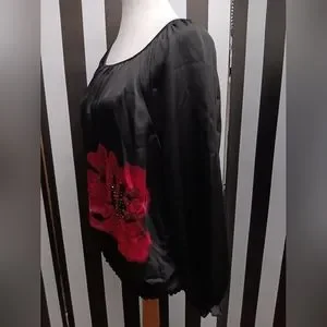 Black charter club top. has rose on left side and ride shoulder with beading. elastic waist. 3/4 sleeve soft silky material. 100% polyester. great condition.