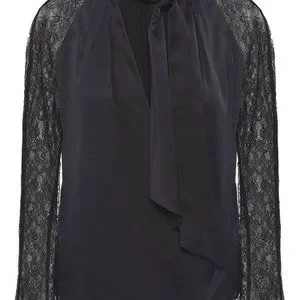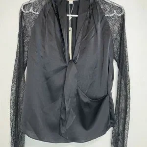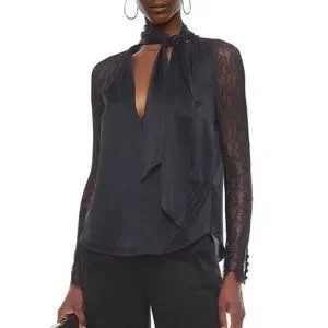 Jonathan Simkhai Satin Tie Neck Chantilly Lace Sleeve Wrap Black Blouse XS