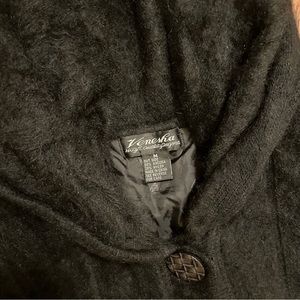 Vintage quality Angora wool swear cape with hood. Extremely cozy and perfect for layering. Has pockets, snap buttons, and is lined. The hood wraps around you and can double as a scarf or shrug to keep you extra warm.