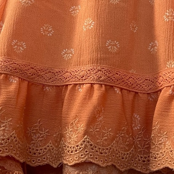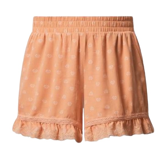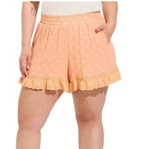 These NWT peach shorts by Torrid are flirty but also as cute as can be. They have a crocheted ribbon near the bottom that includes a large ruffled and eyelet design. Since the legs are wide and the inseam is 5” they have a sewn in shorts. Super comfortable they are pull-ons with side pockets. They will come to you in their original packaging from a smoke and pet free home.