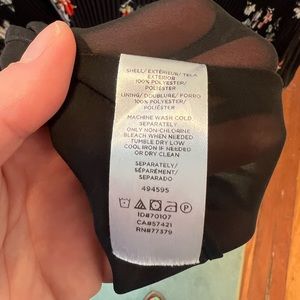Black pleated scoop neck chiffon top with tiny floral print and. Lined. 100% polyester.