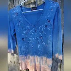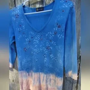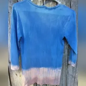 Sivan Women's Medium Floral, Earthtone, Tye dyed 100% Cotton Jersey. 3/4 Sleeve. V-Neck. Length 24 Inches, Pit to Pit 16 Inches, Sleeve 15 Inches. Beautifully Colored.