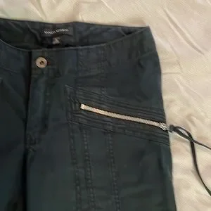 Soft, stretch denim, cropped pants with silver tone zipper front pockets, and long denim tassels. “Patches “ on knees.