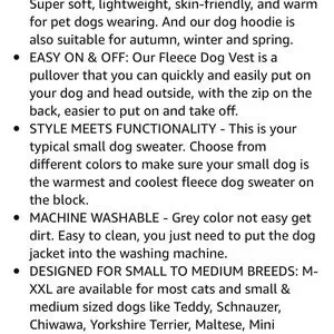 This completely versatile and fashionable fleece pet vest is made for small size dogs and some cats, it is very durable, machine washable, lightweight yet warm and cozy while being easy to put on your dog .please see sizing chart in photos.