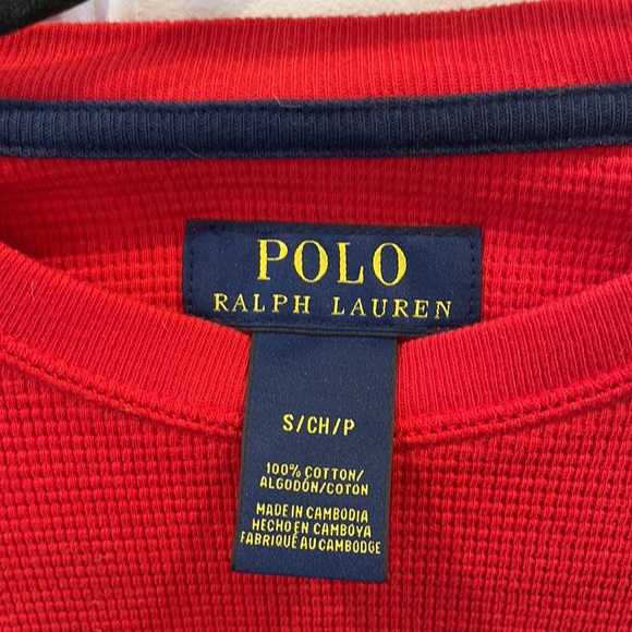 New without tags waffle knot t-shirt by Polo Ralph Lauren in red made of 100% cotton. No stains, tears or rips, size small. Short sleeves with a ribbed crewneck and signature embroidered pony on left chest.