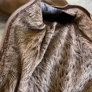 Brown velvety smooth suede with fur lining, slight ruched detail along the mid-calf shaft, a full inner zipper provides ease of entry. 5” heel.