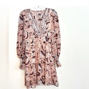 O.P.T Pink Floral Ruffle Long Sleeve V-Neck Dress with Gold Shimmy Speckles. Smocking and ruffled detail at the bottom of sleeves. Side zipper. Sheer sleeves and back. Ruffled layered skirt detail. Lined