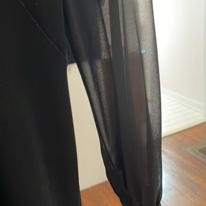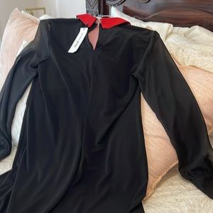 Black cocktail dress with sheer black sleeves, red collar with accent in front